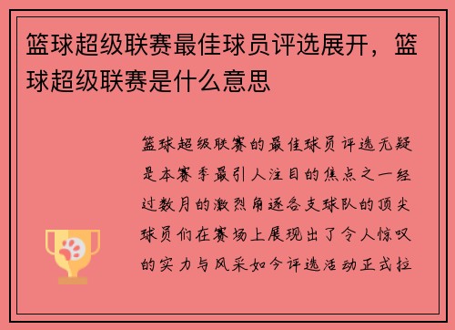 无论最终是谁摘下这荣誉的桂冠,这个赛季的篮球超级联赛无疑都将成为球迷们心中难以忘怀的经典。而最佳球员评选,不仅是对球员的肯定,更是对整个赛季的完美。让我们一起期待,这场篮球盛宴的最终答案!
