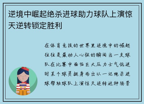 在体育竞技的世界里,逆境中的崛起往往是最动人心弦的瞬间。当一支球队在比赛中面临巨大压力,士气低迷时,某个球员挺身而出,以一记绝杀进球帮助球队上演惊天逆转,这种场景往往成为赛季的经典瞬间,永载史册。无论是在足球、篮球,还是其他竞技项目中,逆境中崛起的绝杀进球不仅体现了个人的超凡能力,更是团队精神的完美体现。在这篇文章中,我们将从四个方面详细探讨这一现象,分析为何绝杀进球在决定胜负的关键时刻如此重要,以及它对球队的意义和影响。通过对绝杀进球的技术层面、心理层面、团队协作层面和赛后影响的详细剖析,我们将全面理解这一体育文化中的辉煌时刻。